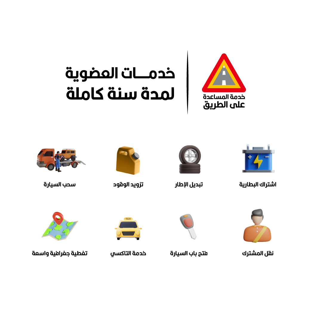 • مدة عضوية خدمة المساعدة على الطريق هي سنة كاملة تبدأ من تاريخ تفعيل العضوية.