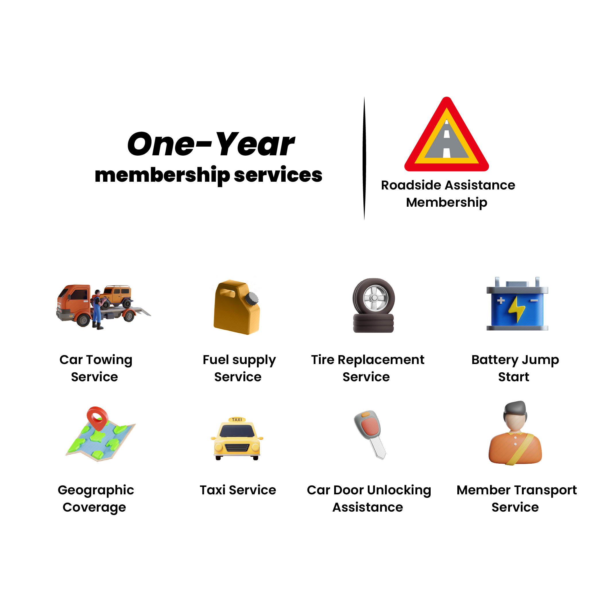 • Car Towing Service: In case of a mechanical/electrical failure that prevents the car from operating or being driven. Towing is provided to a single specified destination within the city (to a workshop chosen by the member) and between cities (to the nearest service center chosen by the member in the closest city to the breakdown location).